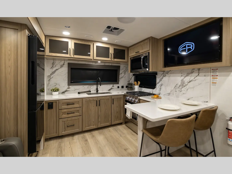 Sleeps 2 Slides 2 Length 29 ft 11 in Ext Width 8 ft Ext Height 11 ft 7 in Hitch Weight 1022 lbs Dry Weight 7655 lbs Cargo Capacity 2210 lbs Fresh Water Capacity 54 gals Grey Water Capacity 78 gals Black Water Capacity 39 gals Furnace BTU 35000 btu Available Beds King Refrigerator Type 12V Cooktop Burners 3 Number of Awnings 1 LP Tank Capacity 30 lbs Water Heater Capacity 6 gal Water Heater Type Quick Recovery Gas/Electric TV Info LR Smart TV Awning Info 19' Power w/Adjustable Rain Dump & LED Lights Axle Count 2 Washer/Dryer Available Yes Number of LP Tanks 2 Shower Type Shower w/Seat Electrical Service 50 amp Similar Floorplans