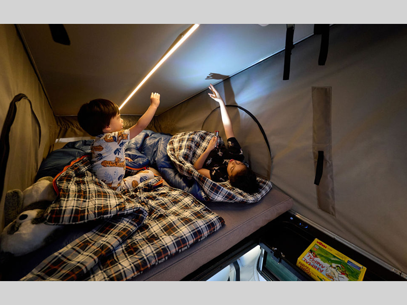 - Pop top sleeping area offers a large bed and storage tray with charging ports