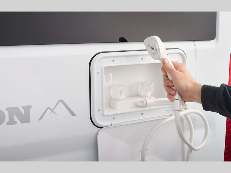 Each model includes a power awning that will allow you to sit outdoors in the shade with your book, and you can easily wash off your hiking boots with the outside shower. These models include everything you need while you're away from home, including a cooktop, refrigerator to store perishables, ample storage space for your belongings, plus an on-board wet bath, so you don't have to use the camp's facilities.