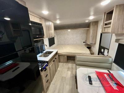 This travel trailer is designed to make camping more comfortable, affordable, and fun for the whole family! The front 60" x 80" queen bed offers a comfortable place to lay your head at night and a shirt closet to hang your clothes. There are a set of 48" x 68" bunk beds for others to sleep, and you can even transform the 38" x 68" booth dinette into extra sleeping space. The fully equipped kitchen has everything you need to prepare a delicious home cooked meal and a 12V refrigerator to store any leftovers. After a fun-filled day, head to the rear corner bathroom to freshen up in the 30" x 36" shower with a skylight to let in some natural lighting!