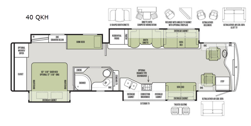 *Cannot option Air Coil Sofa on Driver Side and Passenger Side. Certain variations of furniture combinations will affect sleeping capacity. Certain variations will restrict walkway space.