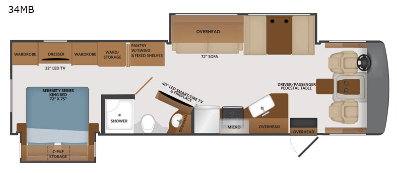 This motorhome offers all of the conveniences and comforts of home from the rear private bedroom featuring a king-size Serenity Series bed with CPAP storage above it to the kitchen pantry with swing and fixed shelving. The living area is the perfect place to gather and wind down your nights in true comfort by relaxing on the 72" sofa while you enjoy watching your favorite movie on the 40" LED Smart/Fire TV, and there is even a fireplace below it. There is plenty of storage throughout the inside between the overhead cabinets, the two wardrobes and dresser in the rear bedroom, and the wardrobe/storage closet across from the full bathroom. There is even 134 cu.ft. of exterior storage for your larger camp gear!